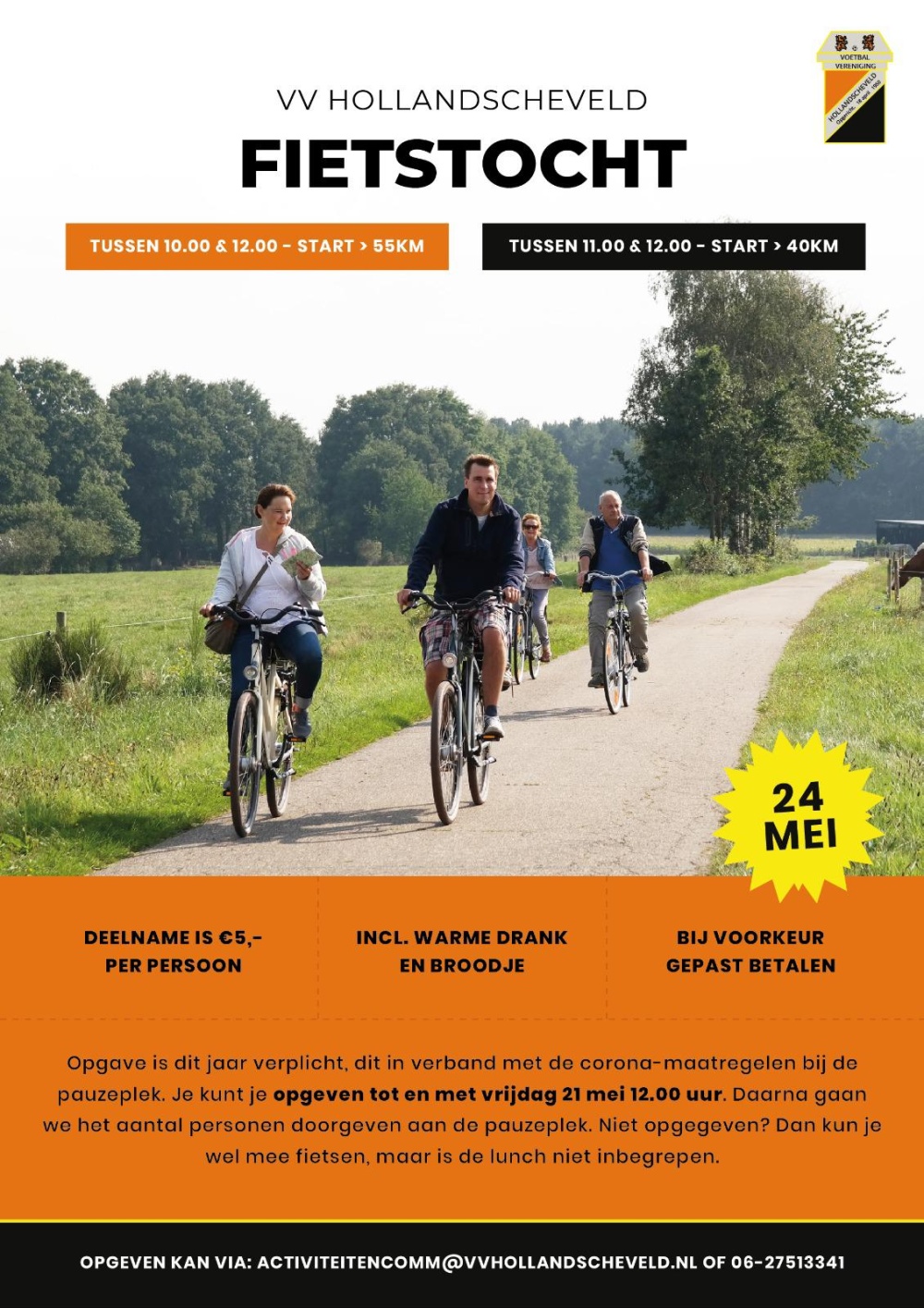 Je kunt op opgeven via activiteitencomm@vvhollandscheveld.nl of via 0627513341