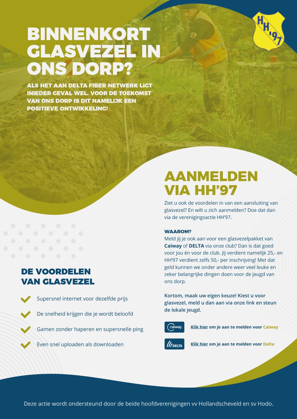 Voor ieder huishouden dat zich via de jeugdtak van beide verenigingen aanmeld voor een glasvezel aansluiting gaat er €50,00 naar HH’97. Zelf krijgt men ook nog een welkomstpremie van €25,00. De inkomsten die HH’97 hierdoor binnenkrijgt zullen gebruikt worden voor het kledingfonds van HH’97. Daarmee wordt de jeugd weer picobello in het nieuw gestoken. Beide hoofdbesturen willen u bij deze dan ook oproepen om u via HH’97 aan te melden als u overweegt om glasvezel te nemen.