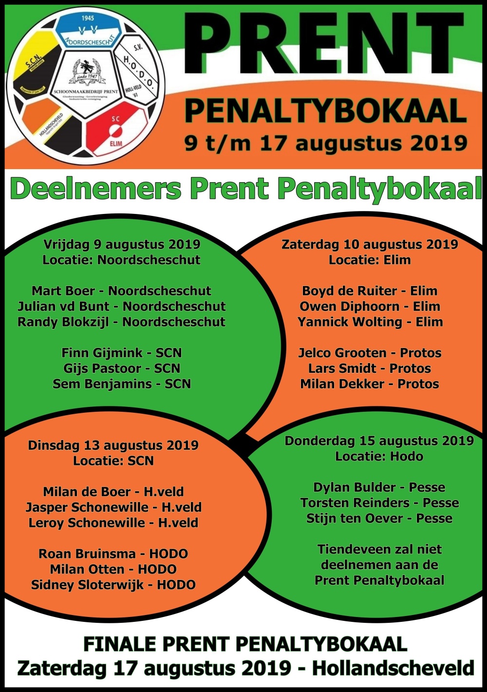 Op zaterdag 17 augustus 2019 nemen de 7 finalisten deel aan de Prent Penaltybokaal Finale. Deze vind plaats aansluitend ná de eerste gespeelde wedstrijden, zo rond 15:45 uur. Ook hier neemt elke speler drie strafschoppen. Dit gebeurt op een vooraf bepaalde volgorde, aangeleverd door de organisatie. Elke speler neemt zijn of haar strafschoppen in één serie, waarna speler twee aan de beurt is. Bij gelijke stand, nadat alle zeven finalisten hun drie strafschoppen hebben genomen, worden strafschoppen om en om genomen, tot er een winnaar is!