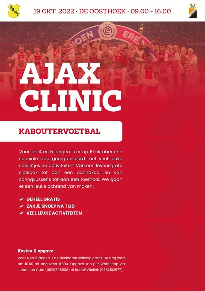 Woensdag is er op sportpark de Oosthoek een Ajax clinic voor de oudere jeugd. Voor de kinderen t/m groep 4 is er dan een voetbal- en speelochtend van 10.00 uur t/m 11.30 uur.